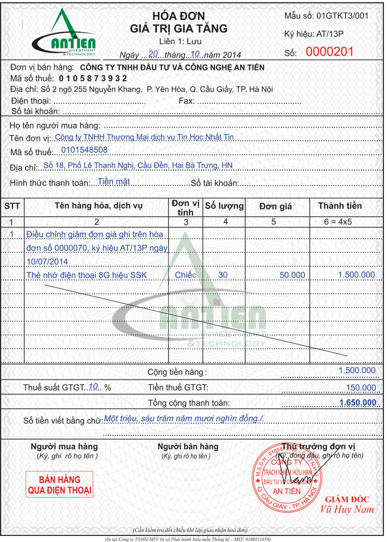 Ngày 10/07/2014 Công ty TNHH đầu tư và Công Nghệ An Tiến bán 1 lô hàng cho Công ty TNHH Thương Mại Dịch Vụ Tin Học Nhất Tín số hoá đơn 0000070, ký hiệu AT/13P. Với nội dung số lượng, đơn giá, thành tiền thỏa thuận trong hợp đồng là: Thẻ nhớ điện thoại 8G hiệu SSK với số lượng 30, đơn giá 130.000đ, thành tiền 3.900.000đ